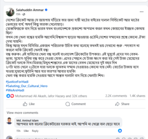 পোস্টে সালাহউদ্দিন আম্মার লেখেন, “আজ যখন বিসিবির একজন পরিচালক উচিত কথা বলেছে, তখনই ভয় দেখানো শুরু-পদত্যাগ না করলে নাকি ক্রিকেট খেলাই বন্ধ! বন্ধ করুক। এই হাতিদের খেলা বন্ধ হলেই বাংলাদেশ ক্রিকেটের উপকার হবে।”